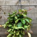 Green leaves with light green and creamy-white variegation which can flush pink. The waxy, pale pink, fragrant flowers with red centres are produced in clusters from May-Sept. Place in well lit position with some sun but shade from hot, midday, summer sun. Water and feed regularly during growing season allowing top of compost to dry in between but sparing ly in winter. Min 10C.