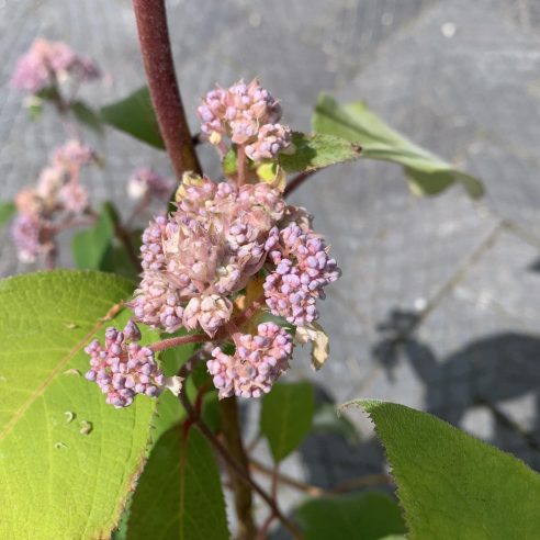 Beautiful species hydrangea. Large lilac blue flowerheads in late summer. Large hairy leaves. Requires moist soil and semi-shade. Height 2m.
