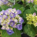 Mophead. Deciduous shrub with strong stem. Intense purple-blue flowers on acid soil, will change on alkaline soil. Good coastal plant. Any moist soil in semi-shade. Height 1m.