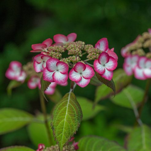 Lacecap. Compact deciduous shrub with red tinged foliage. Pretty pink flowers in alkaline soil or blue in acid soil, star-shaped flowers. Any moist soil in part-shade. Good coastal plant. Height 1-1½m.