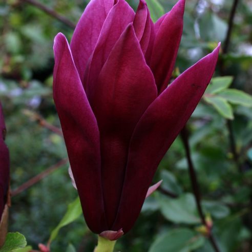Deciduous shrub or small bushy tree. Large narrow vase shape deep purple flowers from late April to early June. Needs a moist, fertile acid to neutral soil, in sun or shade. Height 3m.