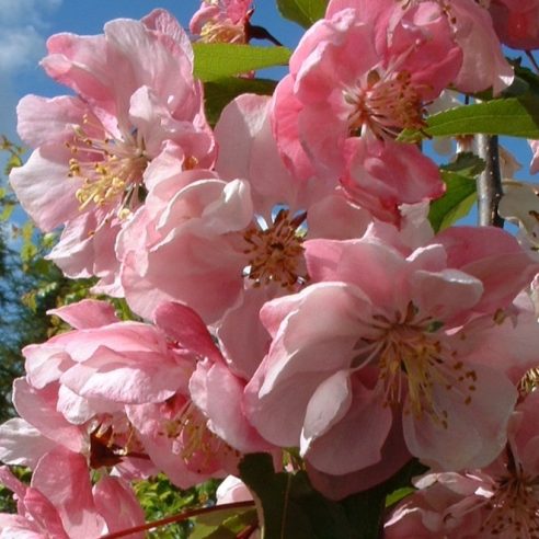 Flowering Crab Apple. A small tree of coloumnar habit. The semi-double flowers are rose-scarlet in bud opening pink. Yellow fruits. Any fertile soil in sun or part shade. Height 5-6m.