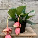The pride of any collection, this magnificent plant produces large, drooping flower heads of pink with prominently veined, oval leaves. It needs a warm, brightly lit spot away from direct sun or with sun filtered through a translucent blind or curtain. Allow top of compost to dry in between waterings, keep drier in winter. Mist frequently and stand pot on pebble tray. Min 15C in winter.