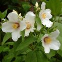 Deciduous compact shrub bearing single white flowers flushed with maroon at the base. Flowers in June/July. Fragrant. Any soil in sun or shade. Height 2m.