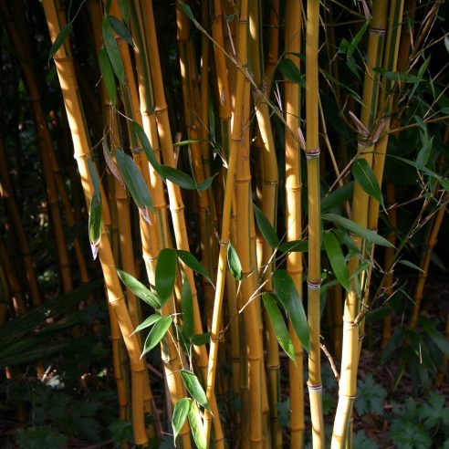 (Bamboo) Hardy elegant bamboo with custard yellow canes streaked with green. Beautiful specimen plant but ultimately large. Invasive shoots may be eaten! Any moist, fertile soil in sun or shade. Height 5-6m.