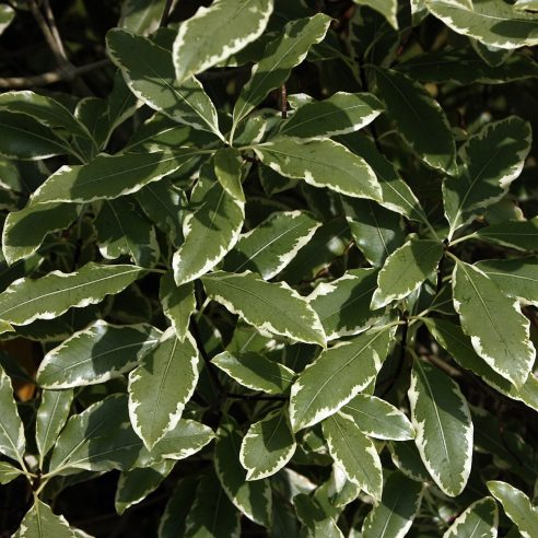 Distinctive evergreen shrub with large variegated leaves. Tiny pale yellow, scented flowers in spring. Well drained soil in sun or part shade. Good coastal plant. Height 1½-2m.