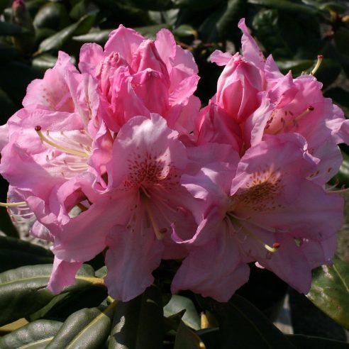 Evergreen shrub bearing rose-pink flower with a brown flare in May/June. Moist acid soil in a sheltered shady position. Height 4m.