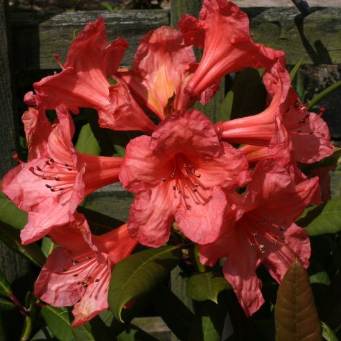 Evergreen shrub bearing large deep orange, funnel-shaped flowers. May/June. Moist acid soil in a sheltered, shady position. Height 2m after 10 years.