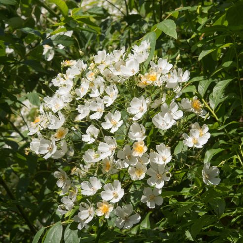 Rambler. 1954. A giant of a rose ideal for growing over buildings and through trees. Enormous clusters of scented white flowers. Height 10m.
