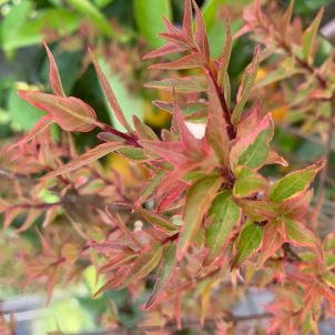 Deciduous shrub with reddish-orange, yellow and green leaves. Deep pink flowers in summer. Any soil in sun or partial shade. Height 60-90cm.