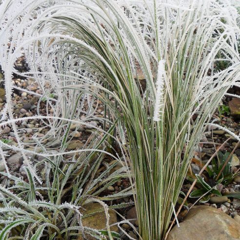 A beautiful feathery grass producing clumps of fine bright green blades which bleach to a pale golden biscuit colour as summer progresses. Flower plumes form an airy haze over the plant in late summer. Any soil in full sun. Height 30-45cm.
