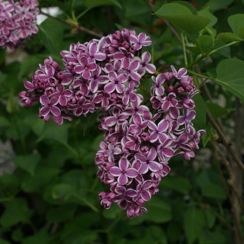 Deciduous shrub or tree. Single purple-red flowers edged with white in May and June. Large panicles. Any soils, especially chalk. Best in full sun. Height 2-3m.